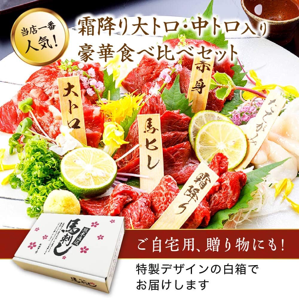 上赤身馬刺し(約50g)×1/霜降り馬刺し (約50g)×1 /大トロ馬刺し (約50g)×1 /たてがみ馬刺し (約50g)×1 /馬ヒレ刺し (約50g)×1の5種類食べ比べセット。