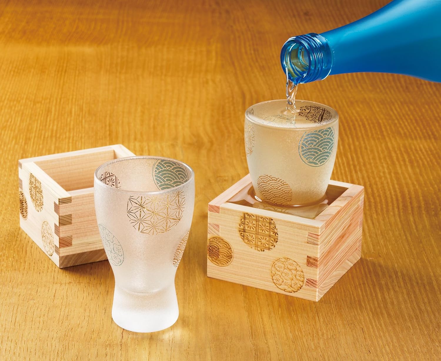 氷晶のようにキラキラと煌めくグラス表面、そのグラスに金彩文様を躍らせたモダンで涼しげな風合いの趣ある枡付きグラスです。